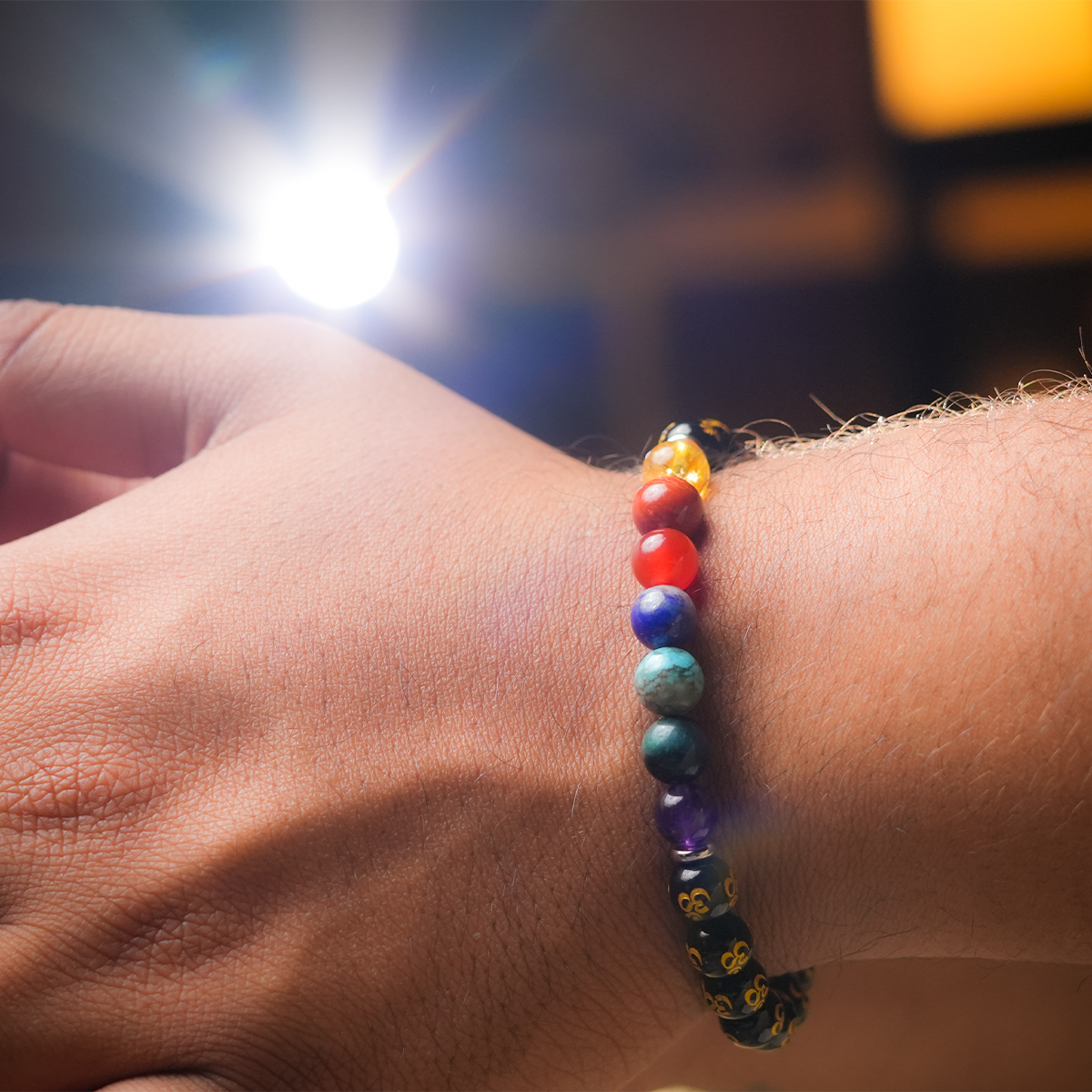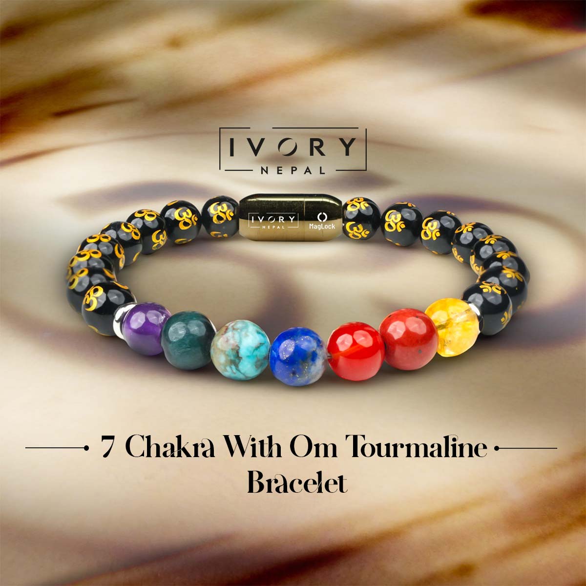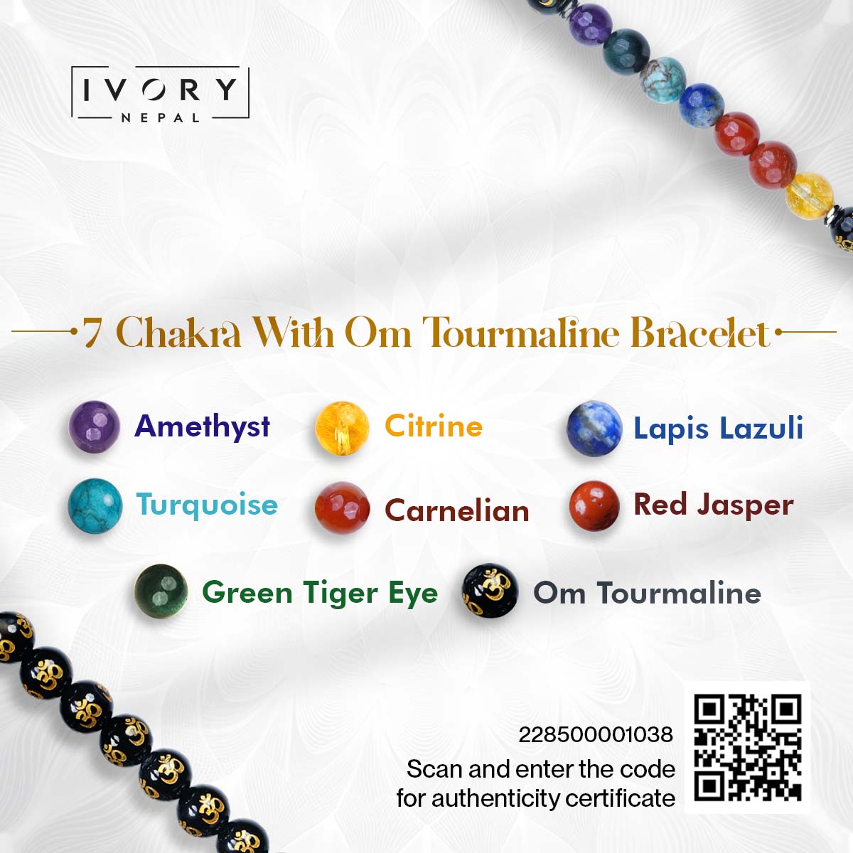 The 7 Chakra Bracelet with OM Tourmaline is built for clarity and quiet steadiness.