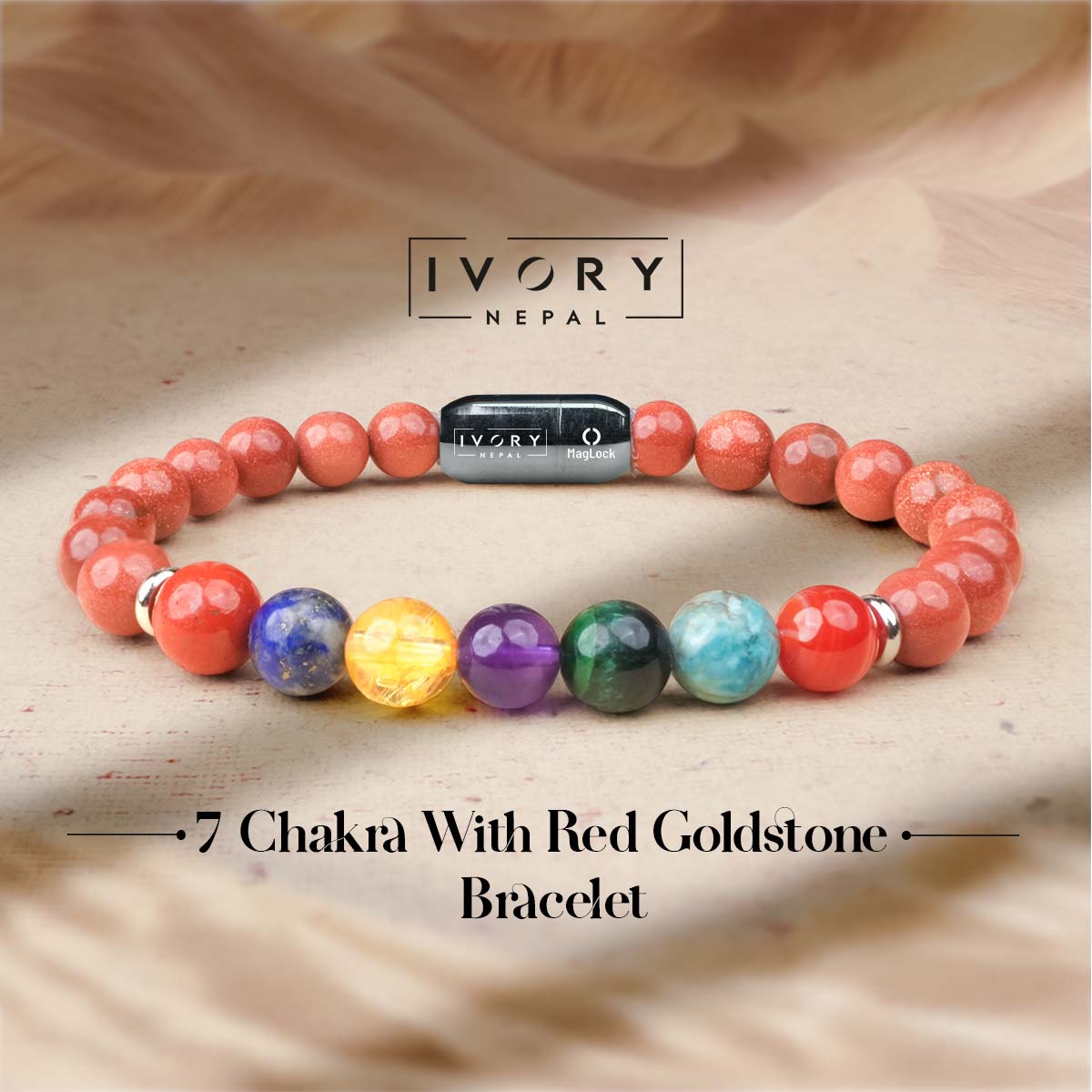 The 7 Chakra Bracelet with Red Goldstone is built for bold energy, sharp focus, and steady momentum when standing still is not an option.