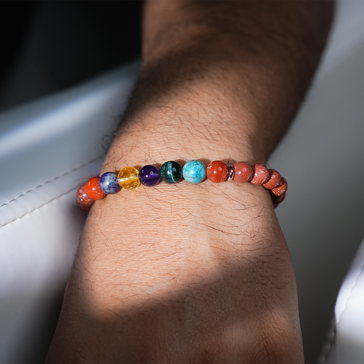 The 7 Chakra Bracelet with Red Goldstone is built for bold energy, sharp focus, and steady momentum when standing still is not an option. This bracelet is made for moments where action matters more than words.