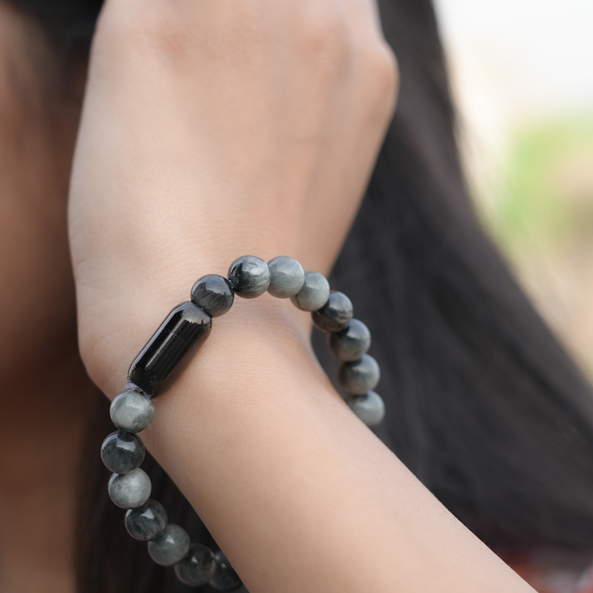 The Grey cat’s eye bracelet supports focus by keeping distractions away.